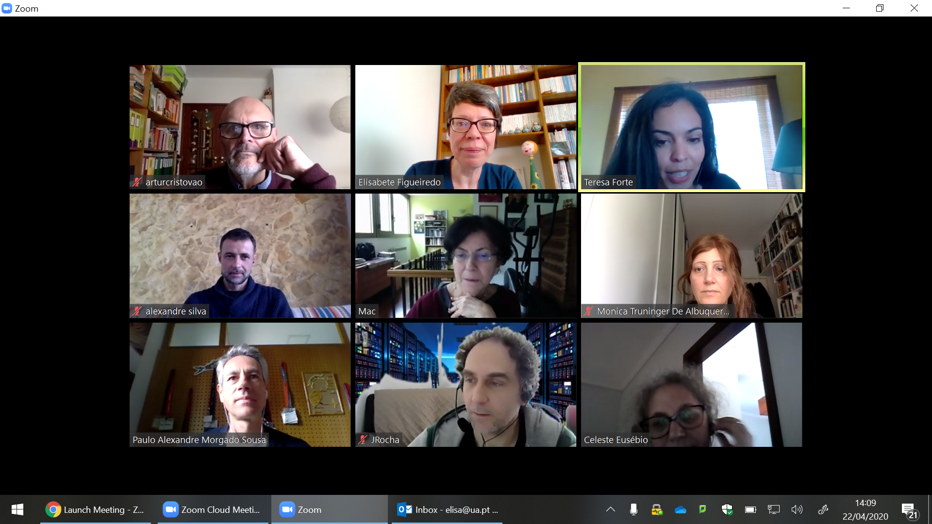 On April 22, 2020, STRINGS team members meet online, using Zoom, to discuss the tasks performed so far and to planned the tage and tasks ahead. Elisabete Figueiredo, Carlos Rodrigues, Celeste Eusébio, Teresa Forte, Carlos Ribeiro (University of Aveiro), Mónica Truninger, Alexandre SIlva (ICS -UL) , Jorge Rocha, Paulo Morgado (IGOT - UL), Manuel Luís Tibério (UTAD) together with the project consultants - Maria Fonte and Artur Cristóvão - discuss the progress of the project and the fieldwork ahead, taking into account the new situation of COVID19.