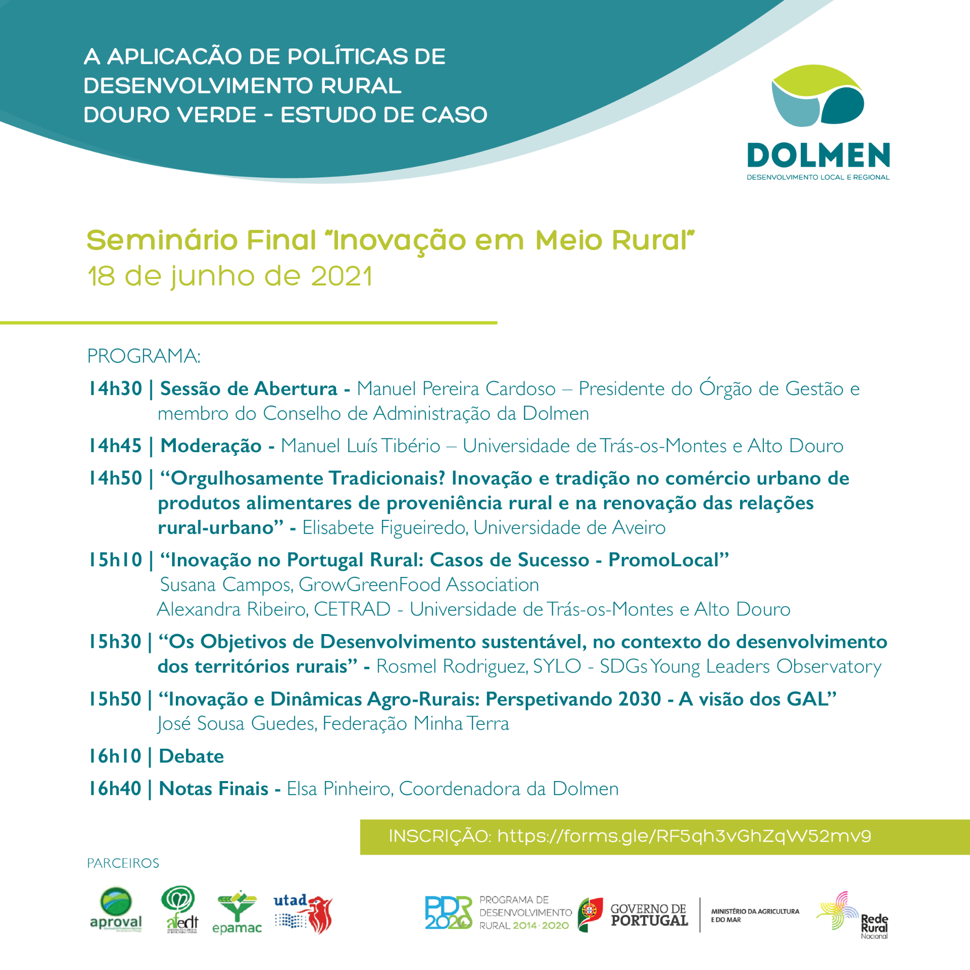 The Seminar is organized by DOLMEN - Local and Regional Development and will be held online on the 18 of June 2021 (14h30). The Seminar will be in Portuguese.